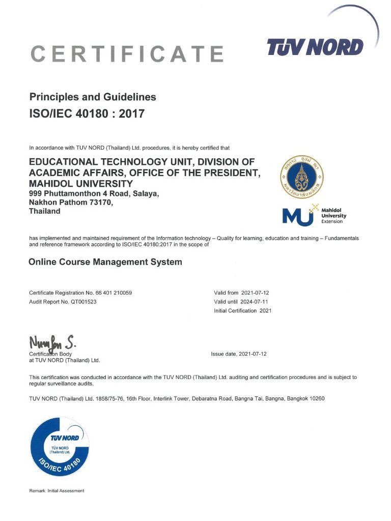 เมื่อเร็วๆ นี้ มหาวิทยาลัยมหิดลได้รับการรับรองระบบการจัดการคุณภาพและการบริหารงานด้าน e-learning และ MOOC ตามมาตรฐาน ISO/IEC 40180:2017 เพื่อยกระดับการจัดการคุณภาพ และการบริหารงานด้านการพัฒนาบทเรียนออนไลน์ให้มีคุณภาพเป็นที่ยอมรับในระดับสากลครั้งแรกในประเทศไทย โดย บริษัททูฟ นอร์ด (ประเทศไทย) จำกัด ซึ่งมีสำนักงานใหญ่อยู่ ณ ประเทศเยอรมนี นับเป็นก้าวแรกที่สำคัญยิ่งของมหาวิทยาลัยมหิดล ในฐานะผู้นำในการพัฒนาคุณภาพบทเรียนออนไลน์ให้ได้มาตรฐานสากลอย่างยั่งยืน ท่ามกลางสถานการณ์ COVID-19 ที่ทั่วโลกพลิกโฉมการเรียนรู้สู่ระบบออนไลน์อย่างเต็มรูปแบบ