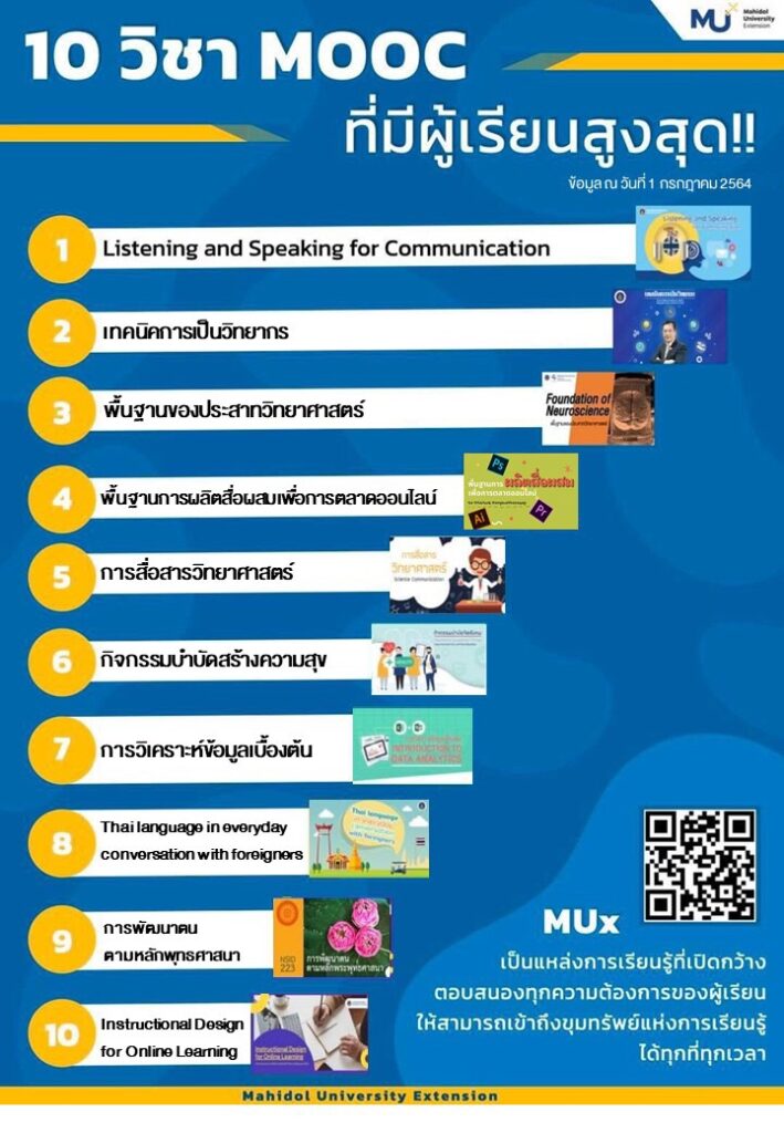ซึ่งที่ผ่านมา มหาวิทยาลัยมหิดลได้เปิดกว่า 100 หลักสูตรให้ประชาชนผู้สนใจทั่วไปได้เลือกลงทะเบียนเรียนออนไลน์ พร้อมรับประกาศนียบัตรเมื่อผ่านการอบรมตามเกณฑ์วัดผลที่กำหนดของแต่ละหลักสูตร สมัครและเข้าอบรมออนไลน์ได้โดยไม่เสียค่าใช้จ่ายที่ mux.mahidol.ac.th