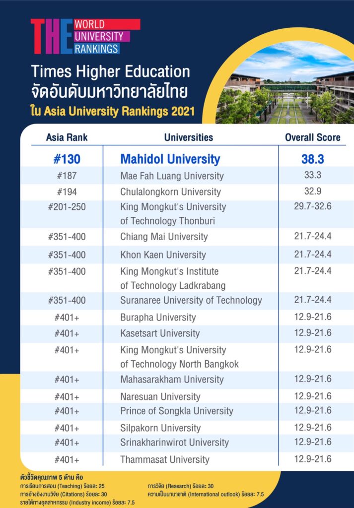 Times Higher Education Asia University Rankings 2021 พิจารณาจากตัวชี้วัดคุณภาพ 5 ด้าน คือ การเรียนการสอน (Teaching) ร้อยละ 25, การวิจัย (Research) ร้อยละ 30, การอ้างอิงงานวิจัย (Citations) ร้อยละ 30, รายได้ทางอุตสาหกรรม (Industry Income) ร้อยละ 7.5 และความเป็นนานาชาติ (International Outlook) ร้อยละ 7.5 โดยมีมหาวิทยาลัยจากทั่วภูมิภาคเอเชียเข้าร่วมจัดอันดับในปีนี้จำนวนทั้งสิ้น 551 แห่ง จาก 30 ประเทศ ซึ่งผลจากการจัดอันดับ Times Higher Education Asia University Rankings 2021 ปรากฏว่า มหาวิทยาลัยมหิดลเป็นอันดับที่ 1 ของประเทศไทยในภาพรวม (Overall Ranking) โดยอยู่ในอันดับที่ 130 ของเอเชีย ดูรายละเอียดที่เว็บไซต์ https://www.timeshighereducation.com/news/asia-university-rankings-2021-results-announced