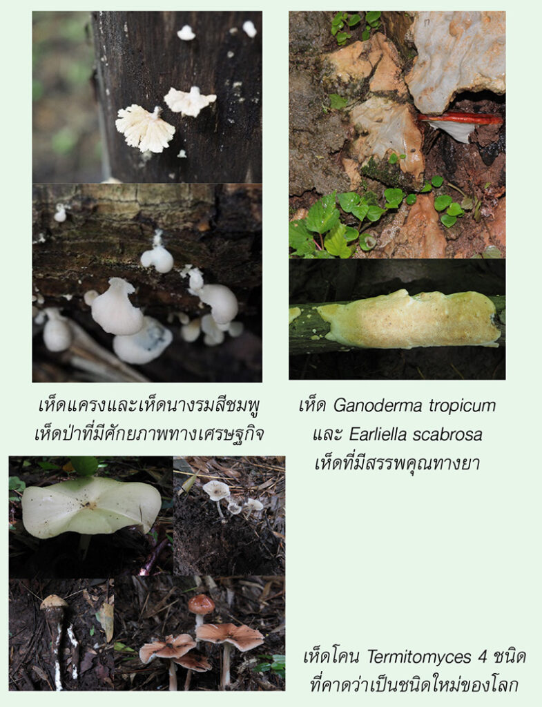 ศึกษาความหลากหลายของเห็ดป่ากินได้และเห็ดทางยา เพื่อนำองค์ความรู้ไปต่อยอดสู่การพัฒนาผลิตภัณฑ์ด้านสุขภาพและอาหาร อันเป็นการเพิ่มมูลค่าทรัพยากรธรรมชาติให้เกิดรายได้แก่ชุมชน พร้อมทั้งส่งเสริมการใช้ประโยชน์เห็ดพื้นถิ่นอย่างถูกต้อง ปลอดภัย และยั่งยืน ควบคู่กับการอนุรักษ์ความหลากหลายทางชีวภาพของผืนป่า ผลการสำรวจพบเห็ดจำนวน 83 ชนิด ใน 44 สกุล ประกอบด้วยเห็ดกินได้ที่มีศักยภาพทางเศรษฐกิจ เช่น เห็ดแครง เห็ดนางรมสีชมพู รวมถึงเห็ดที่มีสรรพคุณทางยา เช่น Ganoderma tropicum, Earliella scabrosa นอกจากนี้ยังพบเห็ดที่มีศักยภาพด้านการผลิตเอนไซม์ซึ่งเกี่ยวข้องกับอุตสาหกรรมสิ่งทอ การกำจัดสีย้อม การฟื้นฟูทางชีวภาพ ตลอดจนการย่อยสลายอินทรียวัตถุ อีกทั้งพบเห็ดโคน (Termitomyces) จำนวน 4 ชนิดที่คาดว่าอาจเป็นชนิดใหม่ของโลก ทีมวิจัยได้รวบรวมและนำข้อมูลเห็ดที่สำรวจพบเผยแพร่ในเว็บไซต์ Fungi of Thailand (www.biotec-fungi.com) เพื่อเป็นแหล่งข้อมูลอ้างอิงสำหรับผู้สนใจและสนับสนุนการใช้ประโยชน์ทรัพยากรเห็ดของประเทศอย่างยั่งยืนต่อไป