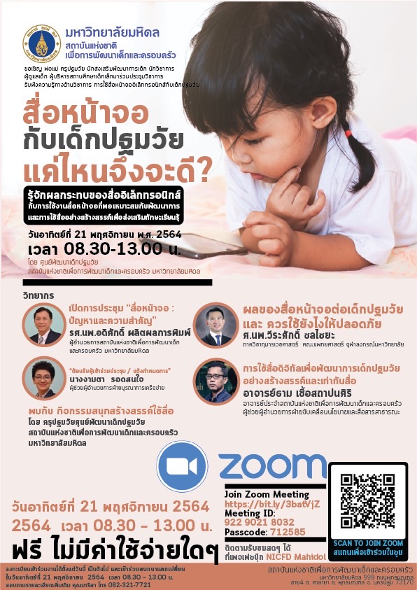 21 พฤศจิกายน 2564 เวลา 08.30 – 13.00 น. ขอเชิญหาคำตอบ “สื่อหน้าจอกับเด็กปฐมวัย แค่ไหนจึงจะดี” ได้ในเสวนาออนไลน์จัดโดย ศูนย์พัฒนาเด็กปฐมวัย สถาบันแห่งชาติเพื่อการพัฒนาเด็กและครอบครัว มหาวิทยาลัยมหิดล ผู้สนใจสามารถเข้าฟังได้โดยไม่เสียค่าใช้จ่าย ติดตามรายละเอียดได้ที่ FB: NICFD Mahidol