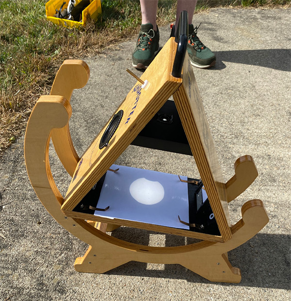 อีกวิธีเป็นอุปกรณ์อันใหญ่เบิ้มที่ต่อออกมาจากกล้องโทรทรรศน์เก่าแก่ขนาด 12 นิ้วของเรา โดยนำฉากรับเข้าไปอยู่ในตำแหน่งเราจะเอาดวงตาไปส่องดู ก็จะเกิดภาพฉาย (project) ลงมา แถมขยายขนาดด้วย ถ้าลองมองใกล้ ๆ จะเห็นจุดมืดดวงอาทิตย์ที่มีลักษณะเป็นจุดเงามืดบนนั้นเลย