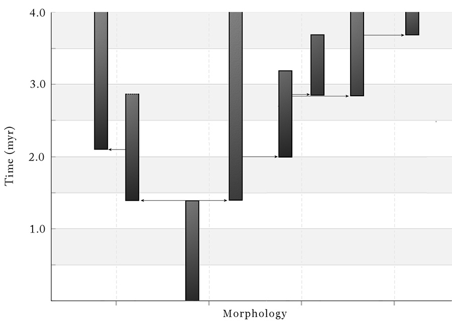 แบบจำลอง punctuated equilibrium อธิบายวิวัฒนาการว่าอยู่นิ่งเป็นเวลานานก่อนจะเปลี่ยนแปลงอย่างรวดเร็วเป็นช่วง ๆ ขณะเกิดชนิดใหม่