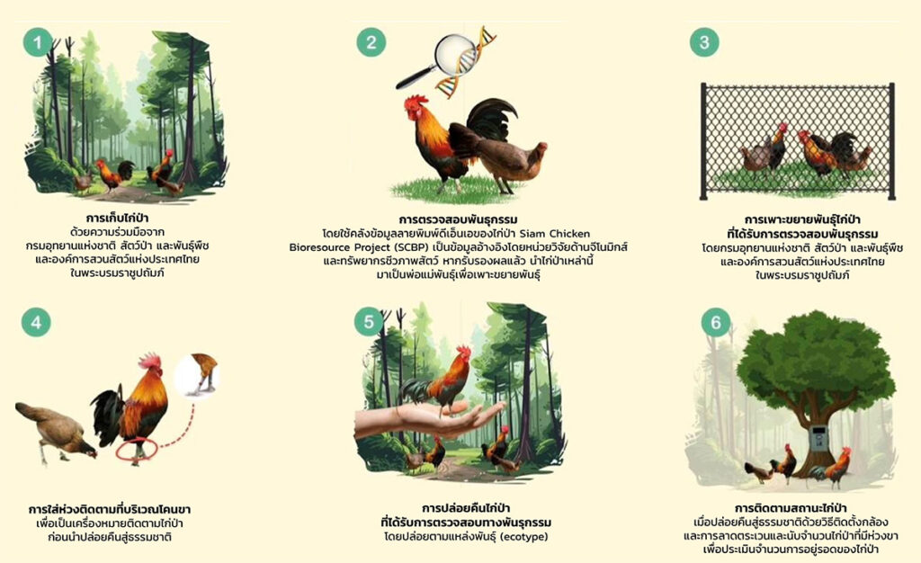 เพื่อฟื้นเสียงขันในป่าและรักษาพันธุกรรมไก่ป่าไทย มหาวิทยาลัยเกษตรศาสตร์ กรมอุทยานแห่งชาติ สัตว์ป่า และพันธุ์พืช และเครือเบทาโกร ได้ร่วมกันพัฒนา “โมเดลความร่วมมือ” ตั้งแต่การวิจัยพันธุกรรม การประเมินพื้นที่ที่เหมาะสม ไปจนถึงการปล่อยไก่ป่าคืนถิ่นอย่างเป็นระบบ ทั้งในภาคใต้ที่สวนกวางเปิดเขาคราม จังหวัดพัทลุง และภาคเหนือที่จังหวัดแม่ฮ่องสอน โดยกิจกรรมเหล่านี้เกิดขึ้นภายใต้ “โครงการอนุรักษ์ เพาะพันธุ์ และเพิ่มประชากรไก่ป่าคืนสู่ธรรมชาติ เพื่อรักษาแหล่งพันธุกรรมและความมั่นคงทางอาหาร” เพื่อต่อยอดและสืบสานพระราชปณิธานของสมเด็จพระนางเจ้าสิริกิติ์ พระบรมราชินีนาถ พระบรมราชชนนีพันปีหลวง ที่ทรงให้ความสำคัญต่อการอนุรักษ์ไก่ป่าและสัตว์ป่าไทยมาอย่างยาวนาน