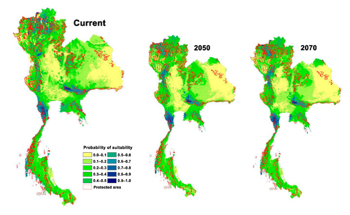 สิ่งที่น่าสนใจคือ เมื่อนักวิจัยคำนวณ “ฉากอนาคต” ในปี พ.ศ. 2593 และ 2613 ผลลัพธ์ชี้ให้เห็นว่าพื้นที่ที่เหมาะสมสำหรับไก่ป่ามีแนวโน้ม “ลดลง” เนื่องจากผลของการเปลี่ยนแปลงภูมิอากาศ (climate change) ทำให้การเลี้ยงดูและการปล่อยคืนต้องมีการวางแผนล่วงหน้า เช่น เลือกพื้นที่ที่ยังเหมาะสมต่อไปในอนาคต มีความต่อเนื่องของป่า ได้รับการคุ้มครองอย่างเข้มงวด เมื่อรู้พื้นที่ที่ดีที่สุดแล้ว ทีมวิจัยจึงสามารถกำหนดจุดปล่อยและออกแบบระบบติดตามและเฝ้าระวัง (monitoring) เพื่อประเมินว่าฝูงไก่ป่าปรับตัว มีลูก และตั้งรกรากได้จริงหรือไม่ ถือเป็นก้าวสำคัญของการอนุรักษ์ไก่ป่าอย่างยั่งยืนในประเทศไทย