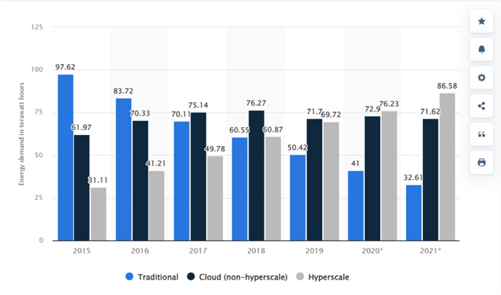 แท้จริงแล้ว “พลังงานไฟฟ้า” เป็นทั้งโอกาสและความท้าทายในการพัฒนาระบบนิเวศดิจิทัลของประเทศที่ส่งผลกระทบชิ่งต่อ ๆ กันเป็นลูกโซ่ นอกจากพลังงานไฟฟ้าจะเป็นตัวกำหนดทิศทางทางเศรษฐกิจใหม่แล้ว ยังเป็นกลไกสำคัญในการพัฒนาโครงสร้างพื้นฐานดิจิทัลของประเทศ อย่าง Data Center ที่ใช้พลังงานอย่างมหาศาลเพื่อรัน Facilities ให้กับธุรกิจต่าง ๆ ข้อมูลจาก Statista พบว่า Hyperscale Data Center มีความต้องการใช้พลังงานเพิ่มมากขึ้นในช่วงสองปีหลัง (2563-2564) อยู่ที่ 76.23 TWh และ 86.58 TWh (TeraWatt-hour, ล้านล้านหน่วยชั่วโมง) ตามลำดับ