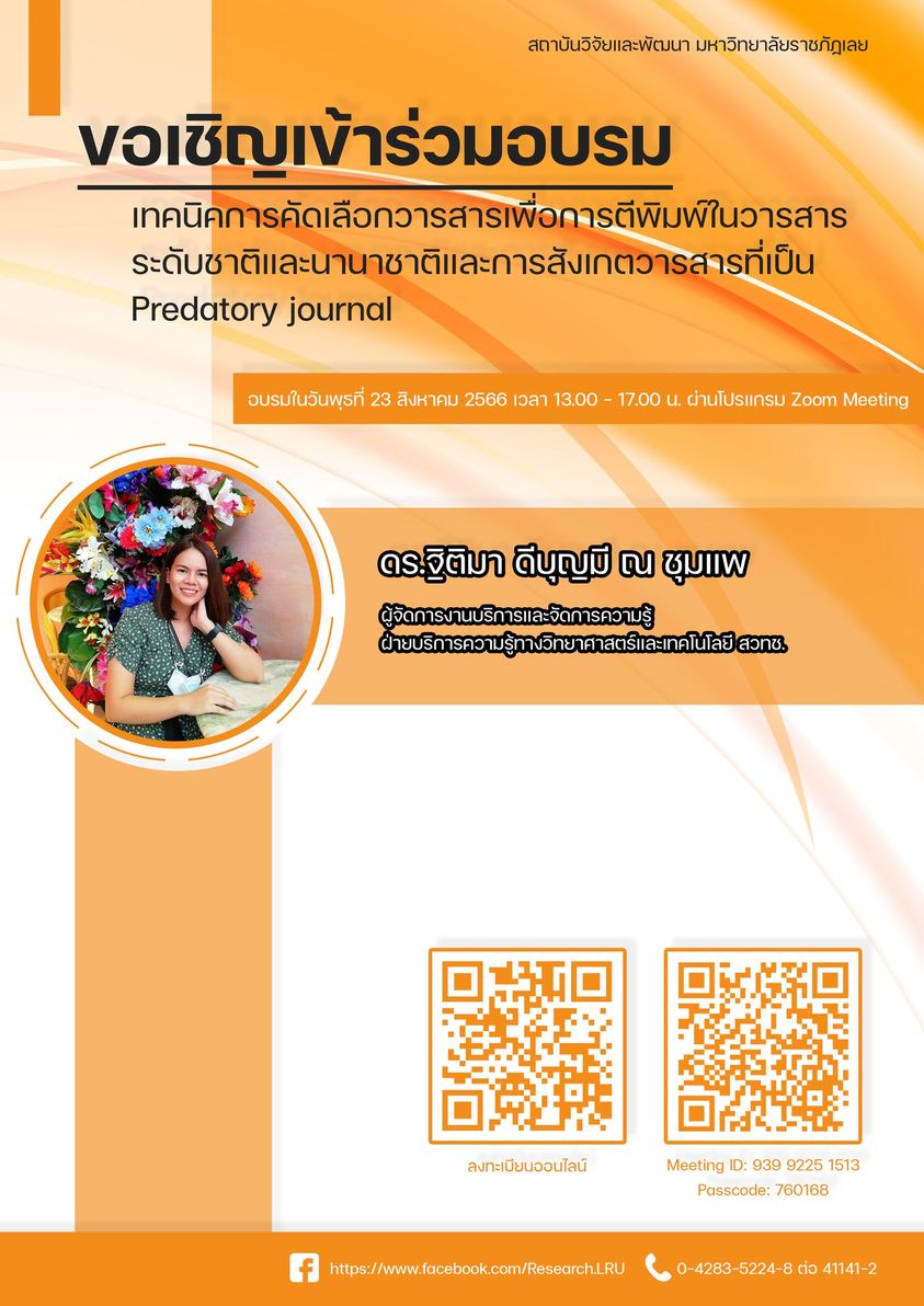วันที่ 23 สิงหาคม 2566 เวลา 13.00 – 17.00 น. ดร. ฐิติมา ดีบุญมี ณ ชุมแพ ผู้จัดการ งานบริการและจัดการความรู้ ฝ่ายบริการความรู้ทางวิทยาศาสตร์และเทคโนโลยี (STKS) ได้รับเชิญจาก สถาบันวิจัยและพัฒนา มหาวิทยาลัยราชภัฏเลย เป็นวิทยากรบรรยาย เรื่อง เทคนิคการคัดเลือกวารสารเพื่อการตีพิมพ์ผลงานในวารสารระดับชาติและระดับนานาชาติ และการสังเกตวารสารเข้าข่าย predatory journal แก่อาจารย์ นักวิจัย และบุคลากร มหาวิทยาลัยราชภัฏเลย เพื่อส่งเสริมและสนับสนุนให้มีความรู้ ความเข้าใจในการคัดเลือกวารสารเพื่อการตีพิมพ์ในวารสารระดับชาติและนานาชาติ และการสังเกตวารสารที่เป็น predatory journal โดยเป็นการบรรยายในรูปแบบออนไลน์ผ่านโปรแกรม Zoom Meeting