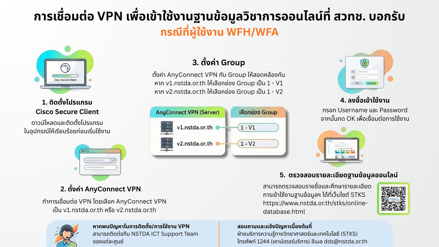- การเข้าใช้บริการฐานข้อมูลออนไลน์ เมื่อใช้งานอุปกรณ์คอมพิวเตอร์เชื่อมต่อกับเครือข่ายภายนอก สวทช. (อินเทอร์เน็ตบ้าน/ เครือข่ายอินเทอร์เน็ตผ่านสัญญาณมือถือ 4G/ เครือข่ายอินเทอร์เน็ตของสถานที่อื่นใด) ต้องล็อกอินเข้าระบบ SSL VPN ของ สวทช. ก่อน ด้วยวิธีใดวิธีหนึ่งดังต่อไปนี้