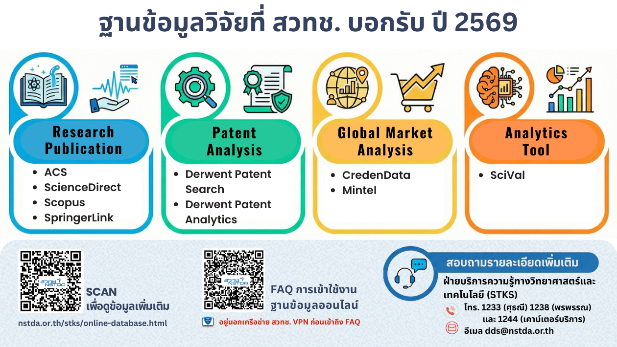 ฝ่ายบริการความรู้ทางวิทยาศาสตร์และเทคโนโลยี ได้ดำเนินการบอกรับฐานข้อมูลออนไลน์เชิงพาณิชย์ และเครื่องมือสนับสนุนการวิจัยพัฒนาที่เกี่ยวข้อง อันประกอบด้วย