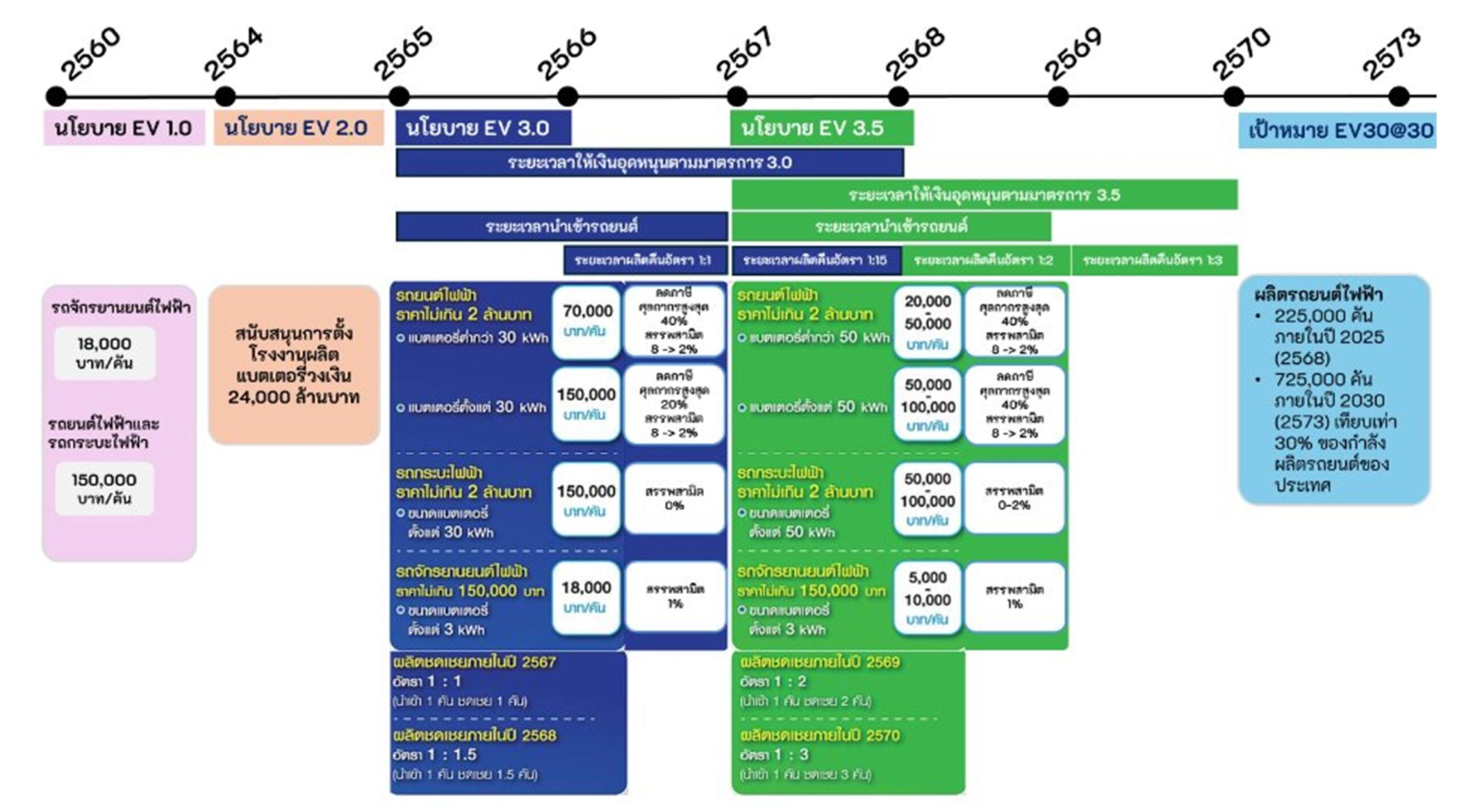 - นโยบาย EV 3.5 (ปี พ.ศ. 2567) : มาตรการต่อเนื่องเพื่อดึงดูดการลงทุนจากผู้ผลิตรถยนต์ทั่วโลก และส่งเสริมการใช้รถยนต์ไฟฟ้าในประเทศ