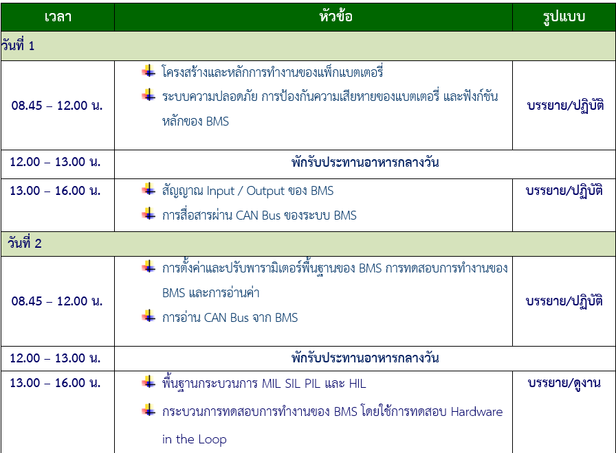 ศูนย์ความเป็นเลิศด้านยานยนต์ไฟฟ้าประเทศไทย (TECE) สำนักงานพัฒนาวิทยาศาสตร์และเทคโนโลยีแห่งชาติ (สวทช.) จัดอบรมหลักสูตรอบรมเชิงปฏิบัติการ “ระบบจัดการแบตเตอรี่เบื้องต้น (BMS) และการทดสอบ HIL สำหรับยานยนต์ไฟฟ้าและระบบกักเก็บพลังงาน” ครั้งที่ 2 วันที่ 12-13 พฤษภาคม 2569