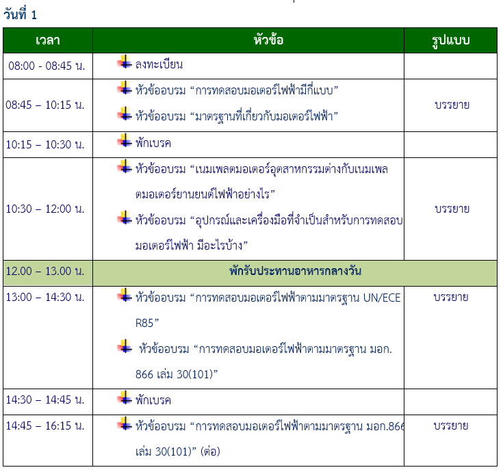 - การเรียนรู้ การทดสอบมอเตอร์ไฟฟ้าตามมาตรฐาน UN/ECE R85 และ การทดสอบมอเตอร์ไฟฟ้าตามมาตรฐาน มอก.866 เล่ม 30(101)