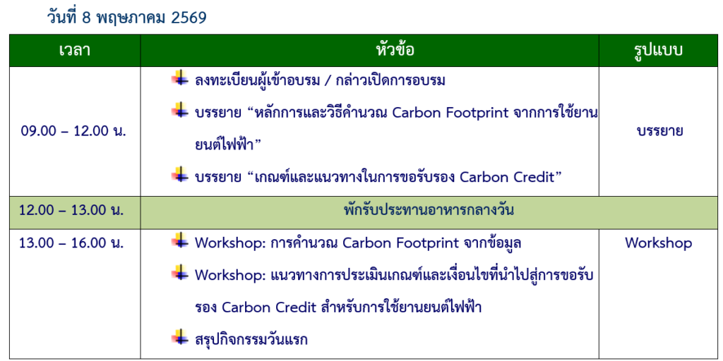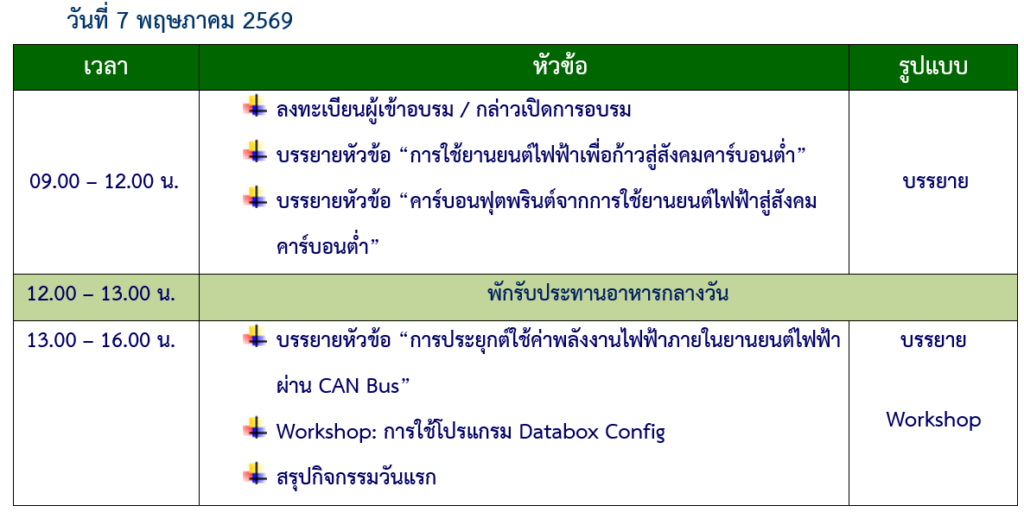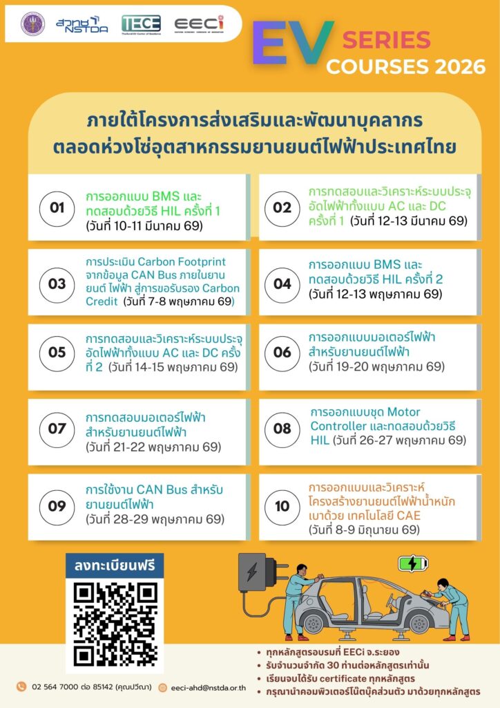 ศูนย์ความเป็นเลิศด้านยานยนต์ไฟฟ้าประเทศไทย  (TECE) สำนักงานพัฒนาวิทยาศาสตร์และเทคโนโลยีแห่งชาติ (สวทช.) จัดอบรมหลักสูตรอบรมเชิงปฏิบัติการ “การประเมิน Carbon Footprint จากข้อมูล CAN Bus ภายในยานยนต์ไฟฟ้า สู่การขอรับรอง Carbon Credit” ครั้งที่ 2 วันที่ 7-8 พฤษภาคม 2569