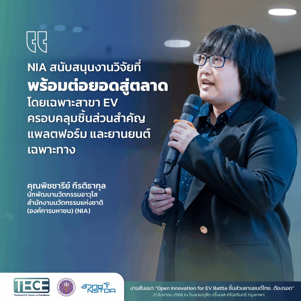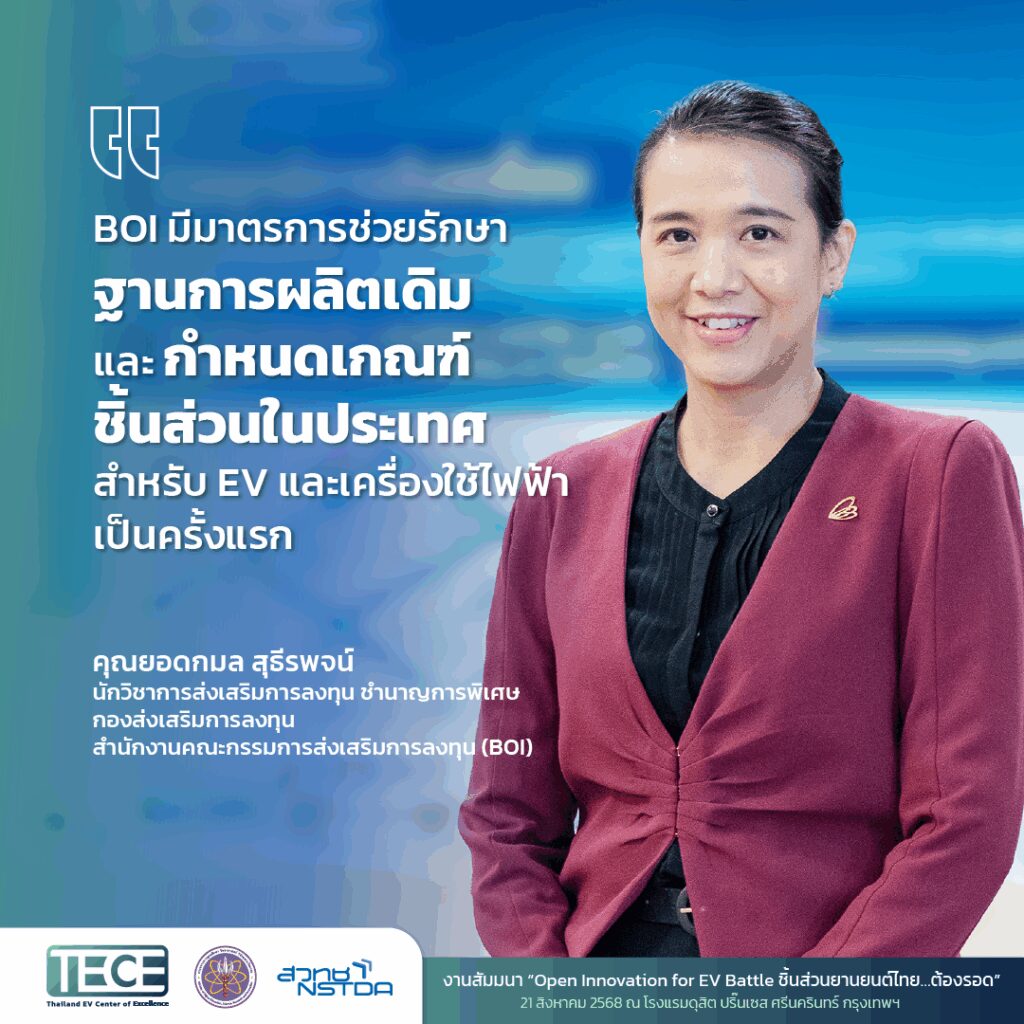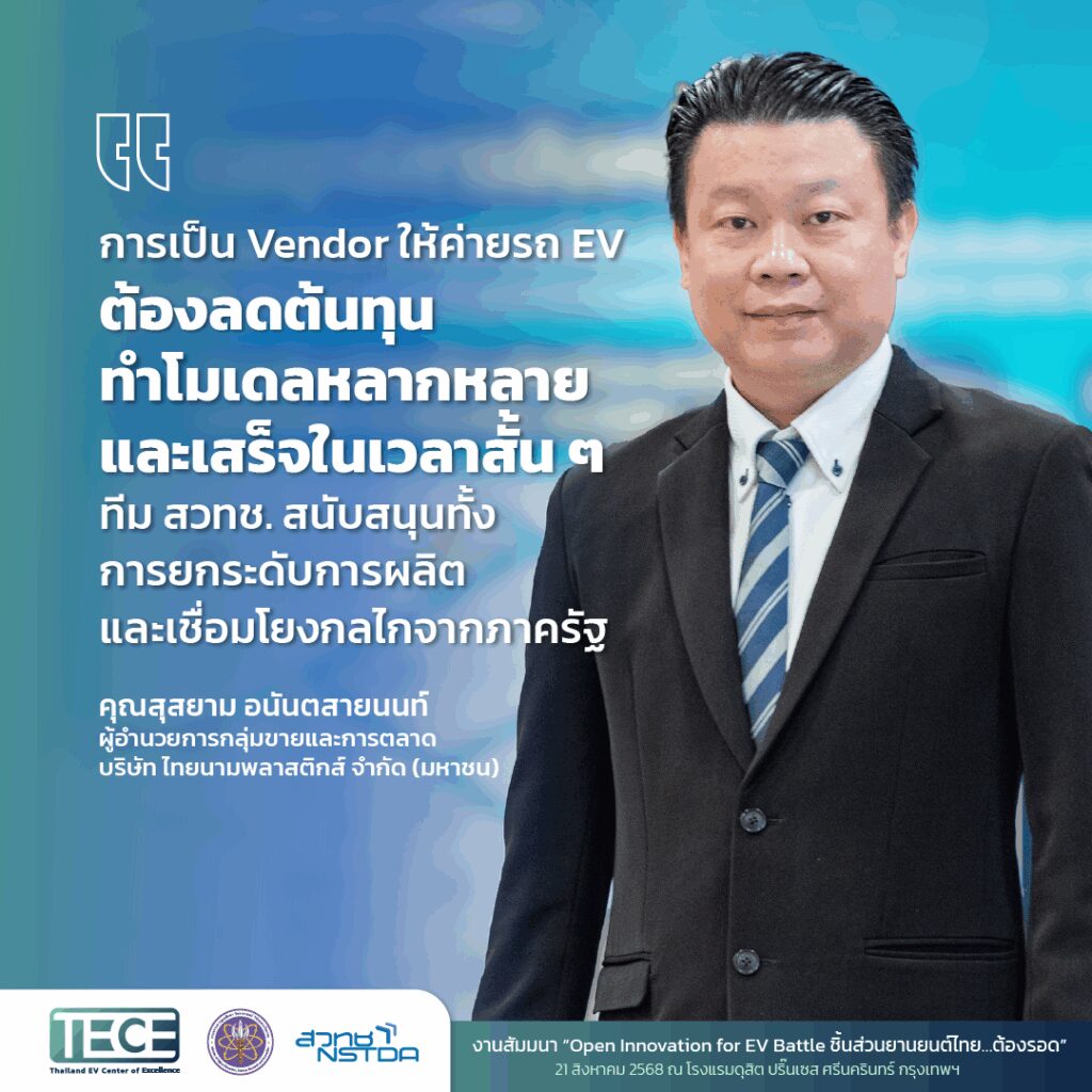 สรุปสาระจากงานสัมมนา📌 “Open Innovation for EV Battle: ชิ้นส่วนยานยนต์ไทยต้องรอด” อุตสาหกรรมยานยนต์ไทยกำลังเผชิญการเปลี่ยนผ่านครั้งสำคัญสู่ยานยนต์ไฟฟ้า งานสัมมนา “Open Innovation for EV Battle: ชิ้นส่วนยานยนต์ไทยต้องรอด” ได้รวบรวมผู้มีส่วนได้ส่วนเสียสำคัญจากทุกภาคส่วน ทั้งผู้ประกอบการ หน่วยงานภาครัฐ สมาคมต่างๆ และสถาบันการเงิน เพื่อร่วมกันวิเคราะห์ความท้าทายและแสวงหาแนวทางการปรับตัวสำหรับอุตสาหกรรมชิ้นส่วนยานยนต์ไทยในยุคใหม่