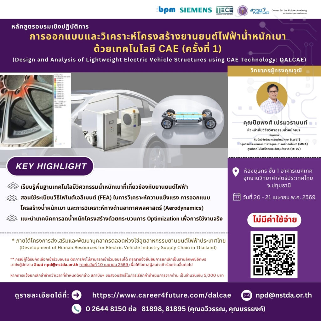 TECE สวทช. เปิดอบรมเชิงปฏิบัติการ "การออกแบบและวิเคราะห์โครงสร้างยานยนต์ไฟฟ้าน้ำหนักเบาด้วยเทคโนโลยี CAE"