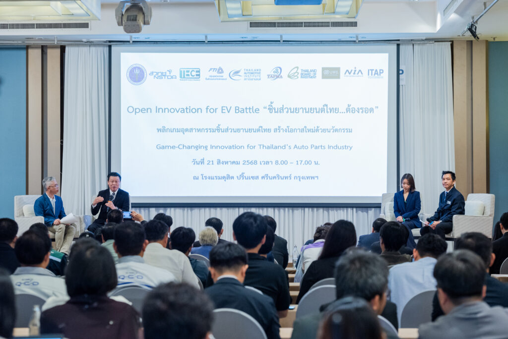 สำนักงานพัฒนาวิทยาศาสตร์และเทคโนโลยีแห่งชาติ (สวทช.) โดย ศูนย์ความเป็นเลิศด้านยานยนต์ไฟฟ้าประเทศไทย (TECE) จัดงานสัมมนา “Open Innovation for EV Battle ชิ้นส่วนยานยนต์ไทย…ต้องรอด” เพื่อระดมความร่วมมือจากทุกภาคส่วนในการผลักดันและเสริมสร้างขีดความสามารถในการแข่งขันให้แก่ผู้ประกอบการชิ้นส่วนยานยนต์ไทย ท่ามกลางความท้าทายของการเปลี่ยนผ่านสู่ยุคยานยนต์ไฟฟ้า (EV)