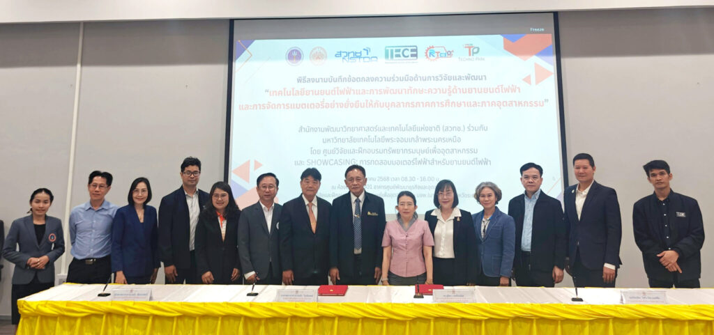 สำนักงานพัฒนาวิทยาศาสตร์และเทคโนโลยีแห่งชาติ (สวทช.) โดย ศูนย์ความเป็นเลิศด้านยานยนต์ไฟฟ้าประเทศไทย (TECE) ร่วมกับ ศูนย์วิจัยและฝึกอบรมทรัพยากรมนุษย์เพื่ออุตสาหกรรม มหาวิทยาลัยเทคโนโลยีพระจอมเกล้าพระนครเหนือ (มจพ.) ลงนามบันทึกข้อตกลงความร่วมมือด้านการวิจัยและพัฒนา “เทคโนโลยียานยนต์ไฟฟ้าและการพัฒนาทักษะความรู้ด้านยานยนต์ไฟฟ้า และการจัดการแบตเตอรี่อย่างยั่งยืนให้กับบุคลากรภาคการศึกษาและภาคอุตสาหกรรม”