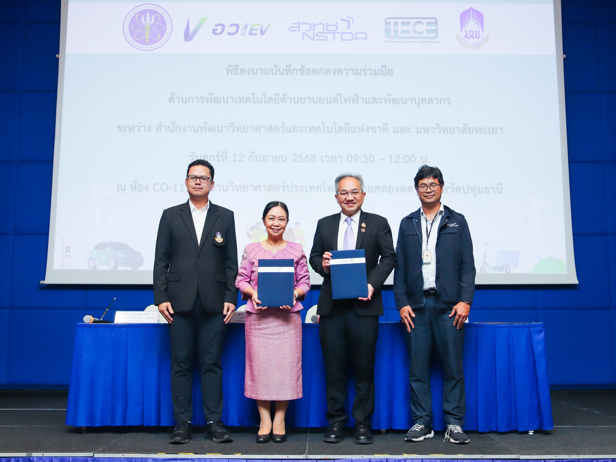 เมื่อวันศุกร์ที่ 12 กันยายน 2568 สำนักงานพัฒนาวิทยาศาสตร์และเทคโนโลยีแห่งชาติ (สวทช.) โดย ดร.สุมิตรา จรสโรจน์กุล ผู้อำนวยการศูนย์เทคโนโลยีพลังงานแห่งชาติ สวทช. ได้ลงนามบันทึกข้อตกลงความร่วมมือ (MOU) กับ มหาวิทยาลัยพะเยา โดย รองศาสตราจารย์ ดร.สุภกร พงศบางโพธิ์ อธิการบดีมหาวิทยาลัยพะเยา ในการพัฒนาเทคโนโลยีและบุคลากรด้านยานยนต์ไฟฟ้า โดยมี ดร.ชินะ เพ็ญชาติ ผู้อำนวยการกลุ่มวิจัยศูนย์เทคโนโลยีโลหะและวัสดุแห่งชาติ สวทช. และผู้ช่วยศาสตราจารย์ สุวิทย์ ปัญญาวงศ์ รองอธิการบดีฝ่ายสิ่งแวดล้อมและภูมิทัศน์ มหาวิทยาลัยพะเยา ร่วมเป็นพยาน ณ อุทยานวิทยาศาสตร์ประเทศไทย