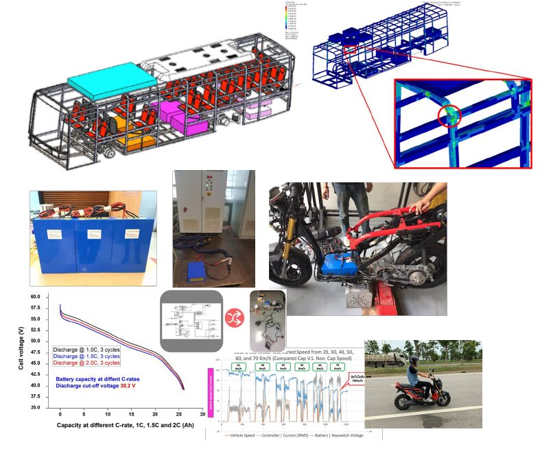 - ออกแบบโครงสร้างตัวถังรถไฟฟ้าครอบคลุม รถโดยสารไฟฟ้า สามล้อไฟฟ้า และสกู๊ตเตอร์ไฟฟ้า