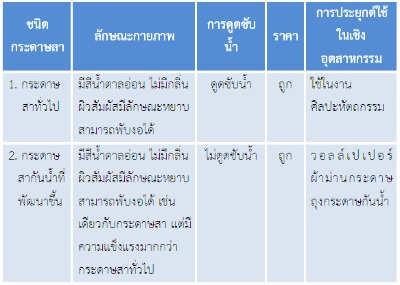 | สรุปเทคโนโลยี กระบวนการผลิตกระดาษกันน้ำที่พัฒนาขึ้น เป็นกระบวนการอย่างง่ายและมีต้นทุนต่ำ นอกจากนี้กระดาษสากันน้ำที่ได้ยังมีลักษณะภายนอก ผิวสัมผัสเช่นเดียวกับกระดาษสาทั่วไป |
