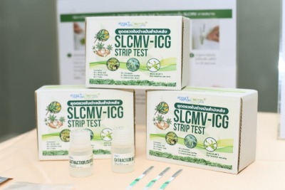 | ที่มา ข้อมูลเบื้องต้น ความสำคัญของปัญหา โรคใบด่างมันสำปะหลังเป็นโรคที่เกิดจากการติดเชื้อ Sri Lankan cassava mosaic virus หรือ SLCMV ที่มีแมลงหวี่ขาวเป็นพาหะ อาการของต้นที่ติดโรค คือ ใบด่างและใบหงิกลดรูป ลำต้นแคระแกร็น และมีการลดลงของผลผลิตทั้งจำนวน ขนาด และคุณภาพของหัวมัน ในกรณีที่มีการระบาดรุนแรงอาจสร้างความเสียหายแก่ผลผลิตมากถึง 80-100% ซึ่งจะส่งผลกระทบต่ออุตสาหกรรมมันสำปะหลังเป็นวงกว้างตั้งแต่ต้นน้ำถึงปลายน้ำ ชุดตรวจโรคใบด่างมันสำปะหลังแบบรวดเร็ว (Immunochromatographic Strip Test) มีความจำเพาะเจาะจง มีความไว และความถูกต้องแม่นยำที่สูง ใช้งานง่าย สามารถพกพาไปตรวจในแปลงปลูกได้ รู้ผลรวดเร็วภายใน 15 นาที ยังไม่เคยมีรายงานการพัฒนาชุดตรวจแบบรวดเร็วสำหรับเชื้อไวรัสใบด่างมันสำปะหลังชนิด SLCMV มาก่อน และยังไม่มีการขายในเชิงพาณิชย์ ชุดตรวจดังกล่าวมีความสำคัญต่อการศึกษาด้านระบาดวิทยา การจัดการควบคุมโรค การปรับปรุงพันธุ์ต้านทาน และการตรวจหาเชื้อในขั้นตอนต่างๆของกระบวนการผลิตท่อนพันธุ์ปลอดเชื้อ |