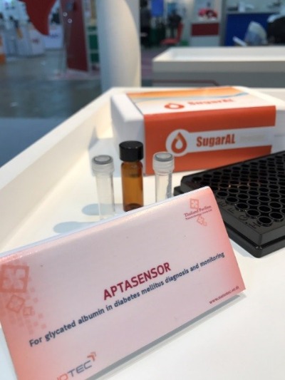 | สรุปเทคโนโลยี SugarAl GO-sensor เป็นการตรวจวัดปริมาณไกลเคทเตดอัลบูมินโดยการใช้สารละลายกราฟีนร่วมกับแอปตาเมอร์ สามารถนำไปวิเคราะห์โปรตีนไกลเคทเตดอัลบูมินได้อย่างมีประสิทธิภาพ สามารถติดตามระดับน้ำตาลในเลือดได้ในช่วงเวลาที่สั้นกว่าการตรวจวัด HbA1C ทั้งยังไม่มีข้อจำกัดในการใช้งานกับผู้ป่วยที่มีภาวะของเลือดที่ผิดปกติอีกด้วย โดยมีค่าความเข้มข้นต่ำสุดที่วัดได้อยู่ที่ 50 ไมโครกรัมต่อมิลลิลิตร ซึ่งมีความไวกว่าชุดตรวจที่ใช้หลักการจับกันของแอนติบอดีกับโปรตีนถึง 2 เท่า ขั้นตอน และวิธีการที่ไม่ยุ่งยาก สามารถอ่านผลได้ภายใน 30 นาที |