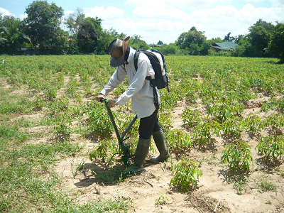 | สรุปเทคโนโลยี เครื่องมือใส่ปุ๋ยในไร่มันสำปะหลัง เพื่อใช้แก้ไขปัญหาค่าจ้างแรงงานภาคเกษตรสูงขึ้นเป็นวันละ 300 บาท เครื่องมือใส่ปุ๋ยมีการออกแบบให้สามารถปรับอัตราการปล่อยเม็ดปุ๋ยได้แม่นยำ 4 อัตรา คือครั้งละประมาณ 15 กรัม, 20กรัม, 25กรัม และ 30 กรัม มีความกะทัดรัด น้ำหนักเบา มีอุปกรณ์ป้องกันดินอุดตันที่ปากเจาะดิน มีเป้สะพายหลังบรรจุเม็ดปุ๋ยได้ประมาณ 15 – 20 กิโลกรัม เครื่องมือใส่ปุ๋ยช่วยลดต้นทุนค่าจ้างแรงงานใส่ปุ๋ยลงได้มาก เพื่อลดต้นทุนการปลูกมันสำปะหลังให้เกษตรกรในประเทศไทย |