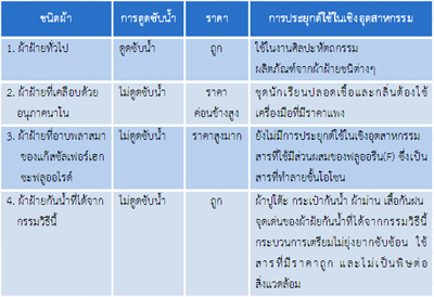 | ที่มา ข้อมูลเบื้องต้น ความสำคัญของปัญหา ผ้าฝ้ายกันน้ำเป็นนวัตกรรมการยกระดับคุณสมบัติของผ้าฝ้ายให้มีคุณสมบัติกันน้ำซึ่งทำให้สามารถนำไปทำเป็นผลิตภัณฑ์ได้หลากหลายมากขึ้นรวมถึงเป็นการเพิ่มมูลค่าของผลิตภัณฑ์ผ้าฝ้าย |