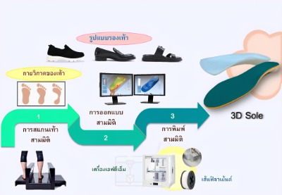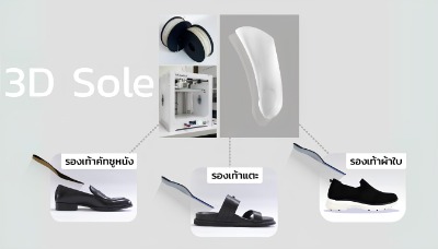 | ที่มา ข้อมูลเบื้องต้น ความสำคัญของปัญหา “3D Sole” เป็นต้นแบบแผ่นรองในรองเท้าเฉพาะบุคคลที่ผลิตจาก "นวัตกรรมระบบการผลิตแผ่นรองในรองเท้าเฉพาะบุคคลจากเทคโนโลยีการพิมพ์สามมิติระบบเอฟดีเอ็ม” ที่ตอบโจทย์ปัญหาสุขภาพเท้าที่เพิ่มขึ้นในทุกวัยที่ไม่ได้จำกัดเพียงกลุ่มวัยทำงานและผู้สูงอายุ และทดแทนกระบวนการผลิตแบบดั้งเดิมที่ใช้วิธีการพิมพ์โฟม หล่อแบบ และแต่งหุ่นปูนปลาสเตอร์ และการขึ้นรูปชิ้นงานอุปกรณ์โดยการอัดขึ้นรูปแผ่นโฟมด้วยความร้อน ซึ่งเป็นวิธีที่ซับซ้อนและใช้เวลา พึ่งพาการนำเข้าจากต่างประเทศของวัสดุ และอาศัยทักษะและความเชี่ยวชาญเฉพาะบุคคลในการผลิต อีกทั้งยังก่อให้เกิดวัสดุเหลือทิ้งจำนวนมาก |