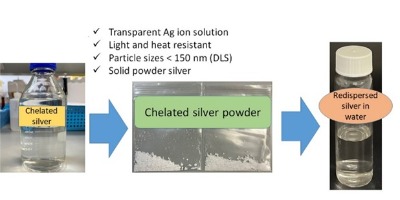 | ที่มา ข้อมูลเบื้องต้น ความสำคัญของปัญหา ไอออนของเงินมีฤทธิ์ฆ่าเชื้อแบคทีเรียและเชื้อราได้ โดยทำให้เอนไซม์ต่างๆ เสียสภาพด้วยการเข้าจับและทำให้ตกตะกอน นอกจากไอออนเงินจะจับกับหมู่ไทออล (thiol; −SH) เกิดเป็นซัลไฟด์ได้ดีแล้ว ยังสามารถทำปฏิกิริยากับหมู่อะมิโน, คาร์บอกซิล, ฟอสเฟต และ อิมิดาโซล ในเอนไซม์หลายชนิดได้ โดยกลไกการฆ่าเชื้อจุลินทรีย์ คือ ไปยับยั้งโปรตีนบนเยื่อหุ้มเซลล์โดยไอออนเงินทำให้เซลล์ตาย และไอออนเงินเข้าไปในดีเอ็นเอ เนื่องจากจุลินทรีย์กินไอออนเงินเข้าไปส่งผลให้ดีเอ็นเอเสียสภาพจากภายในทำให้เซลล์ไม่สามารถเพิ่มจำนวนได้ อย่างไรก็ตาม ปัญหาของไอออนเงินหรืออนุภาคนาโนของเงินนั้นไม่ทนทานต่อแสงและความร้อน ส่งผลให้เกิดการเปลี่ยนแปลงทางกายภาพและทางเคมีซึ่งทำให้ประสิทธิภาพการฆ่าเชื้อลดลง เพื่อแก้ปัญหาดังกล่าวจึงได้มีการสังเคราะห์สารประกอบเงินในรูปไอออนบวกที่สามารถทนทานต่อแสงและความร้อน สามารถคงสภาพเป็นสารละลายใสไม่มีสีเป็นระยะเวลานานและไม่พบการรวมตัวและตกตะกอน นอกจากนี้ยังสามารถทำให้อยู่ในรูปของผงแห้งเพื่อสะดวกในการใช้งานและสามารถละลายน้ำกลับมาเป็นสภาพเดิมตอนต้น คงสมบัติในการฆ่าเชื้อจุลินทรีย์ได้เป็นอย่างดี |