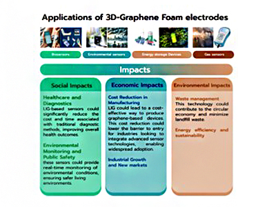 | ที่มา ข้อมูลเบื้องต้น ความสำคัญของปัญหา ปัญหาในการประดิษฐ์ขั้วไฟฟ้ากราฟีนในปัจจุบัน ได้แก่ ความซับซ้อนและต้นทุนสูงของกระบวนการผลิต การควบคุมคุณสมบัติให้สม่ำเสมอทำได้ยาก รวมถึงข้อจำกัดในการออกแบบลักษณะของขั้วไฟฟ้าในรูปแบบต่างๆ ทำให้ขั้วไฟฟ้ากราฟีนที่ผลิตอาจมีโครงสร้างบกพร่อง รวมถึงการใช้สารตกแต่งบางประการในการขึ้นรูปขั้วไฟฟ้าส่งผลให้คุณสมบัติการนำไฟฟ้าลดลง จนถึงการตรึงสารจำเพาะบนผิวกราฟีนยังไม่เสถียร และเกิดการจับแบบไม่เจาะจงได้ง่าย ปัญหาเรื่องการยึดติดกับพื้นผิวและการเชื่อมต่อทางไฟฟ้าอาจยังไม่มั่นคง นอกจากนี้ยังขาดมาตรฐานอ้างอิงที่ชัดเจน และมีความกังวลเรื่องความปลอดภัยและผลกระทบต่อสิ่งแวดล้อมระหว่างกระบวนการประดิษฐ์ที่ในปัจจุบันยังต้องการการปรับปรุงอย่างต่อเนื่อง |
