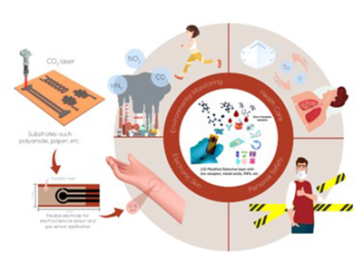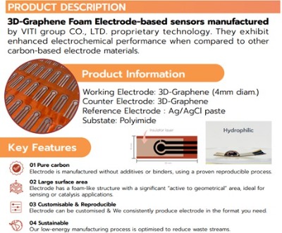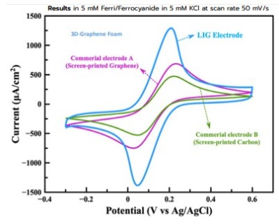 | สรุปเทคโนโลยี ขั้วไฟฟ้ากราฟีนของเราทำการประดิษฐ์ด้วยกระบวนการเหนี่ยวนำด้วยลำแสงเลเซอร์ Laser-induced graphene (LIG) กรรมวิธีนี้มีข้อดีหลายด้านที่เหมาะสมกับการประยุกต์ใช้ในงานเซนเซอร์ โดยสามารถผลิตได้อย่างรวดเร็ว ต้นทุนต่ำ และไม่ต้องใช้สารเคมีอันตราย เป็นกระบวนการประดิษฐ์ขั้วไฟฟ้ากราฟีนที่สะอาด เป็นมิตรต่อสิ่งแวดล้อมและผู้ทำการประดิษฐ์ เนื่องจากไม่ใช้สารเคมีระเหยง่ายใดๆ ในกระบวนการขึ้นรูปขั้วไฟฟ้า อีกทั้งยังสามารถสร้างบนวัสดุราคาถูก เช่น พลาสติกหรือกระดาษ ทำให้เหมาะกับการผลิตแบบพกพาหรือใช้ครั้งเดียว โครงสร้างกราฟีนที่ได้มีลักษณะเป็นรูพรุน (porous) ส่งผลให้มีพื้นที่ผิวสูงและนำไฟฟ้าได้ดี จึงเหมาะสำหรับตรวจวัดด้วยวิธีไฟฟ้าเคมี นอกจากนี้ยังสามารถปรับแต่งลวดลายขั้วไฟฟ้าได้ตามต้องการด้วยเลเซอร์เพียงขั้นตอนเดียว ช่วยให้สามารถออกแบบและผลิตในระดับต้นแบบหรือขึ้นสเกลอุตสาหกรรมได้ง่าย.หากเทียบค่าการนำไฟฟ้าของขั้วไฟฟ้าที่ได้กับขั้วไฟฟ้าลักษณะใกล้เคียงกันในท้องตลาดปัจจุบัน ขั้วไฟฟ้าที่ได้ให้ค่าการนำไฟฟ้าที่มากกว่า 2 – 3 เท่าโดยเฉลี่ย |