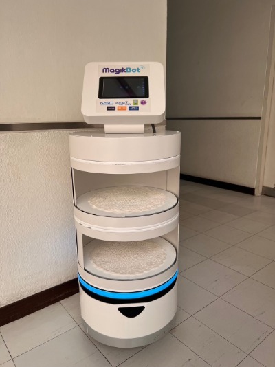 | จุดเด่นของเทคโนโลยี หุ่นยนต์บริการส่งของอัตโนมัติภายในอาคาร มีคุณสมบัติและลักษณะเด่นดังนี้ 1. เคลื่อนที่ไปยังตำแหน่งต่างๆได้อย่างอัตโนมัติ 2. โดยสารลิฟต์โดยสารได้เองโดยอัตโนมัติ ซึ่งใช้การรับส่งคำสั่งควบคุมลิฟต์โดยสารผ่านแพลตฟอร์มปุ่มกดลิฟต์ไร้สัมผัสที่สามารถควบคุมผ่านอินเทอร์เน็ตของสรรพสิ่ง (MagikTuch-IoT) 3. เคลื่อนที่เข้า/ออกลิฟต์โดยสารได้อย่างอัตโนมัติโดยไม่รบกวนกับผู้โดยสารลิฟต |