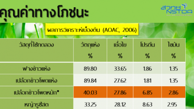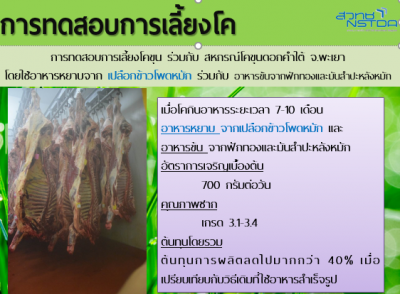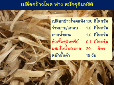 | สรุปเทคโนโลยี จุลินทรีย์ที่คัดเลือกเพื่อใช้หมักเป็นอาหารหมัก silage สูตรที่ได้จากงานวิจัย สามารถใช้หมักวัสดุเหลือทิ้งทางการเกษตรได้หลากหลาย เช่น ฟางข้าว หรือแม้กระทั่งเปลือกข้าวโพดเลี้ยงสัตว์ โดยเมื่อนำมาหมักด้วยจุลินทรีย์ทดลองเปรียบเทียบ พบว่าจะทำให้เปลือกข้าวโพดเลี้ยงสัตว์มีโปรตีนเพิ่มขึ้นเป็น 6-8 % ไขมันเพิ่มเป็น 2.5-3 % ซึ่งมีสารอาหารใกล้เคียงกับหญ้ารูซี่สด อีกทั้งยังสามารถหมักพืชประเภทแป้ง เช่น ฟักทอง มันสำปะหลัง เพื่อนำมาเป็นอาหารข้นได้ด้วย |