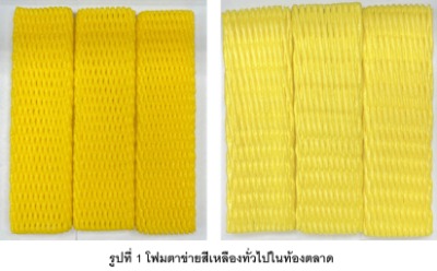 | สรุปเทคโนโลยี โฟมตาข่ายสีเหลืองทอง มีองค์ประกอบของสารที่สกัดจากจากวัสดุชีวมวล หรือวัสดุเหลือทิ้งจากอุตสาหกรรมการเกษตร เพื่อให้ได้โทนสีทอง ลดการใช้สารให้สีเหลืองที่เป็นสารสังเคราะห์ ทำให้ต้นทุนการผลิตโฟมตาข่ายลดลง มีความปลอดภัยต่อผู้ใช้งานมากขึ้น นอกจากนี้สามารถปรับเฉดสีเหลืองทองได้ตั้งแต่อ่อนถึงเข้มตามความพึงพอใจของลูกค้า โฟมตาข่ายสีเหลืองทองมีความเหมาะสมอย่างยิ่งสำหรับการห่อหุ้มผลไม้ส่งออก และผลิตภัณฑ์สินค้าเกษตรแปรรูปที่ต้องการสร้างภาพลักษณ์ที่แตกต่าง ในขณะเดียวกันยังคงคุณสมบัติเรื่องน้ำหนักเบา เนื้อโฟมมีความเหนียวและยืดหยุ่นดี ไม่ขาดง่าย สามารถซับแรงกระแทกได้ดี และช่วยลดความเสียหายตลอดเส้นทางระหว่างขนส่ง กลุ่มเป้าหมาย เช่น ผู้ผลิตมาสเตอร์แบชสี ผู้ผลิตเม็ดคอมเปาด์พลาสติก และผู้ผลิตโฟมตาข่าย เป็นต้น |
